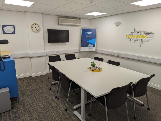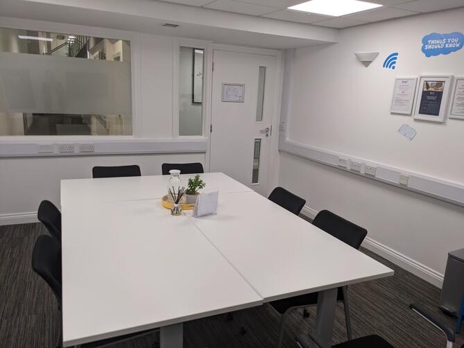 This modern, professional meeting room comfortably seats up to 8 people — ideal for team meetings, presentations, or interviews. The space includes free Wi-Fi, a wall-mounted HD screen and airconditioning. Conveniently located just around the corner from reception, it’s easy to access and simple for guests to find.